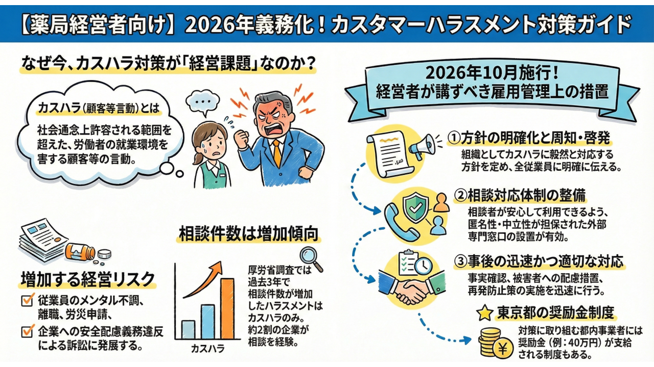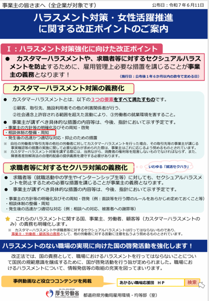 労働施策総合推進法の義務(相談体制の整備) 2026.02.05 2026年 2月告示、10月施行予定。薬局を含む全ての企業に相談体制の整備と周知が求めらているので、弊社は、大手企業とコラボし『外部相談窓口』のご用意致しました。 ナビゲーションボタン 外部相談窓口へ