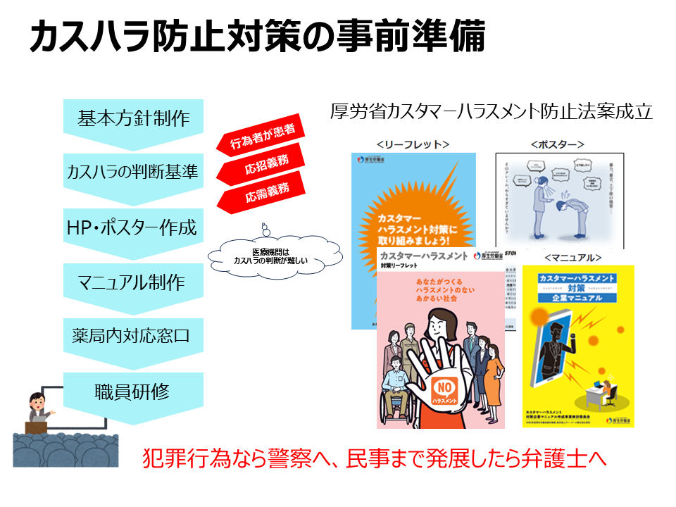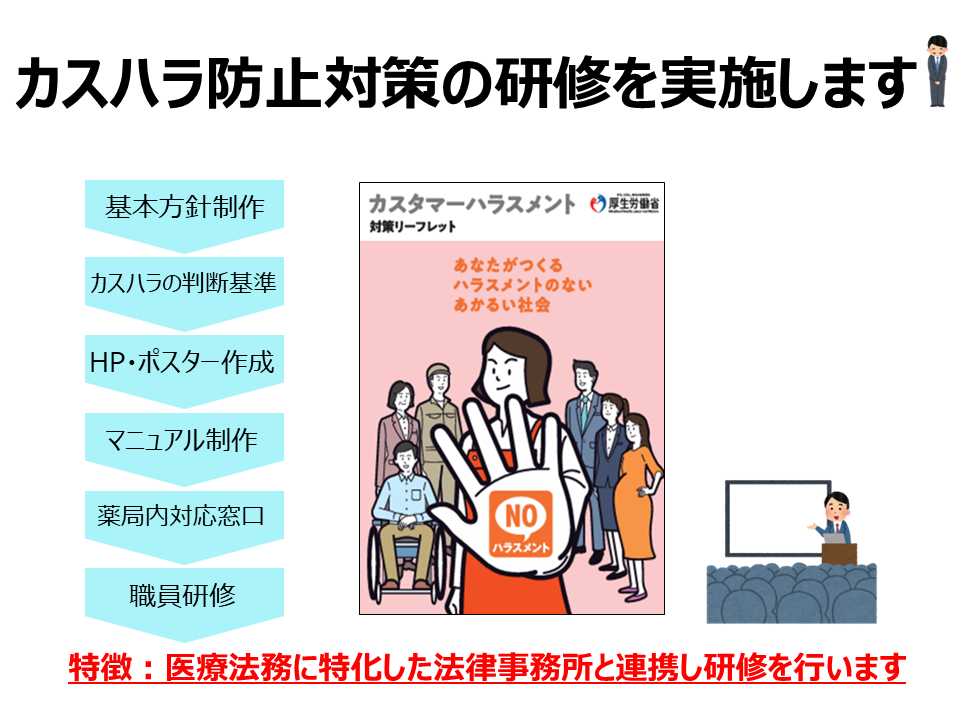 2024年10月「東京都カスタマーハラスメント防止条例」(カスハラ防止条例)が制定され、2025年4月1日より施行、2025年厚生労働省は「カスタマーハラスメント防止」を法整備を目指しています。カスハラは大きな社会問題で、日本労働組合総連合会の調査ではコロナ禍以降の職場でカスハラを受けた人は13.5%、パワハラに次いで多い結果となりハラスメントの中で一番増加しています。カスハラは不当・悪質なクレームで、カスハラとクレームの見極めが難しい場合もあるため、対応には正しい知識が必要です。対応する従業員は疲弊し、その精神的負担から休職・離職をすることもあり、使用者の安全配慮義務(労働契約法5条)の観点から問題があります。従業員を守らなかったという理由で損害賠償責任が生じる場合や、インターネット上に誤った情報が流れ医療機関のイメージダウンにつながり、利用者離れを促進させ、収益低下にもつながります。事業者がカスハラ対策を講じることは急務です。